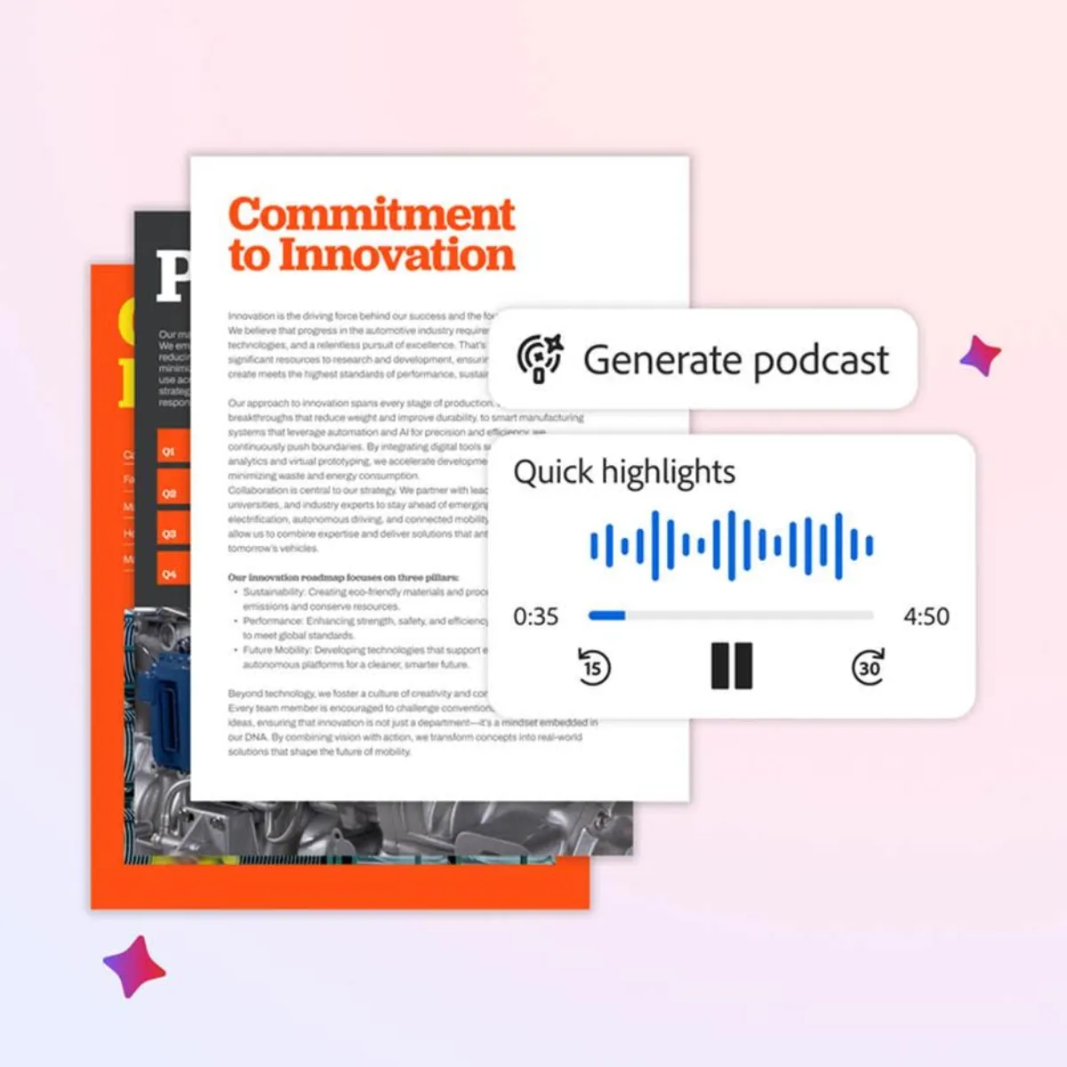 Another new feature, Generate podcast, creates an audio summary from a set of documents. Adobe framed it as a way to work through large volumes of notes, transcripts and long reports when a user does not want to read material on screen.